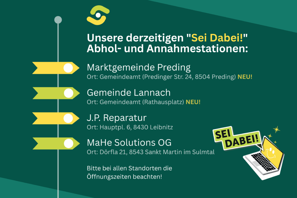 Gemeinsam mit den engagierten EinwohnerInnen von St. Martin im Sulmtal konnten wir im Juni 2023 bei unserer ersten „Sei Dabei!“ IT-Geräte-Reparaturaktion zahlreiche Geräte reparieren und dabei 200 € für ein soziales Projekt in der Gemeinde sammeln. Im Dezember wurde der Betrag feierlich an den Bürgermeister übergeben.